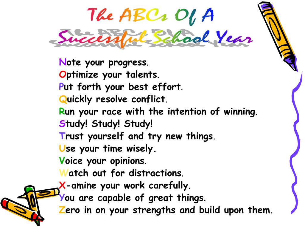 The ABCs Of A Successful School Year Note your progress. Optimize your talents. Put forth your best effort. Quickly resolve conflict. Run your race with the intention of winning. Study! Study! Study! Trust yourself and try new things. Use your time wisely. Voice your opinions. Watch out for distractions. X-amine your work carefully. You are capable of great things. Zero in on your strengths and build upon them.