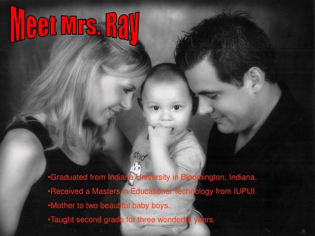 Back To School Night Mrs. Ray. Second Grade. Meet Mrs. Ray. Graduated from Indiana University in Bloomington, Indiana. Received a Masters in Educational Technology from IUPUI. Mother to two beautiful baby boys. Taught second grade for three wonderful years. Cherry Tree Elementary.