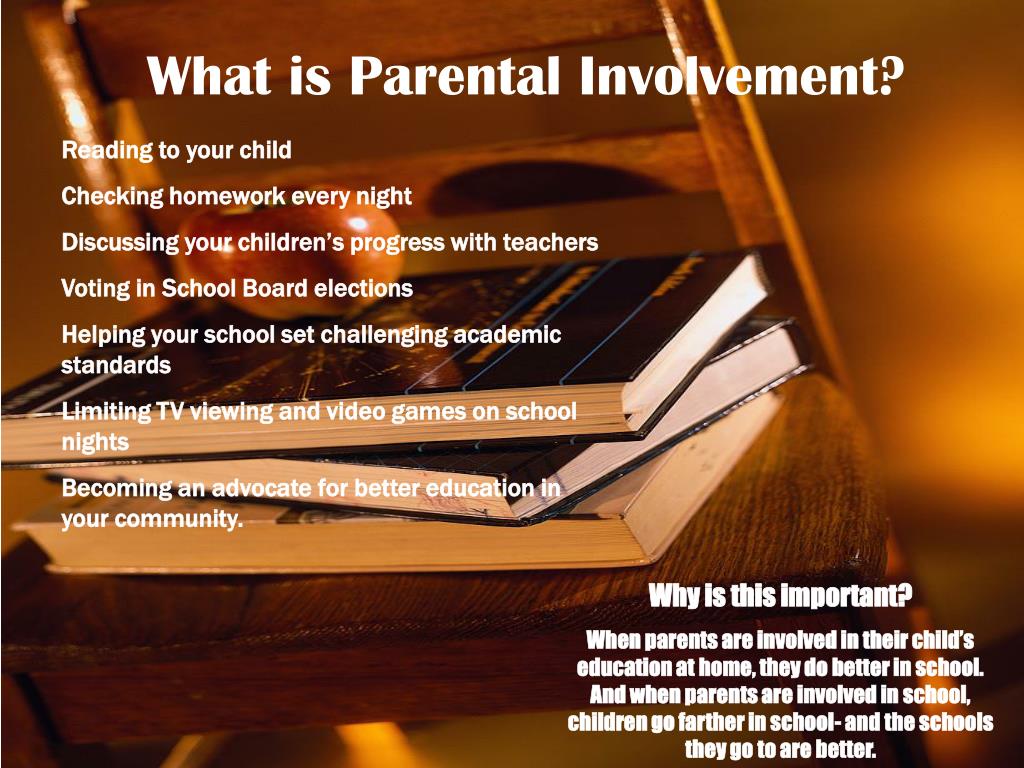 What is Parental Involvement? Reading to your child Checking homework every night Discussing your children’s progress with teachers Voting in School Board elections Helping your school set challenging academic standards Limiting TV viewing and video games on school nights Becoming an advocate for better education in your community. Why is this important? When parents are involved in their child’s education at home, they do better in school. And when parents are involved in school, children go farther in school- and the schools they go to are better.