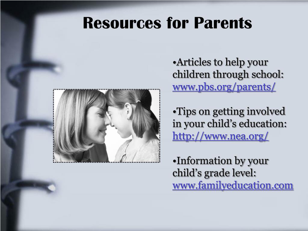 Resources for Parents • Articles to help your children through school: www.pbs.org/parents/ • Tips on getting involved in your child’s education: http://www.nea.org/ • Information by your child’s grade level: www.familyeducation.com