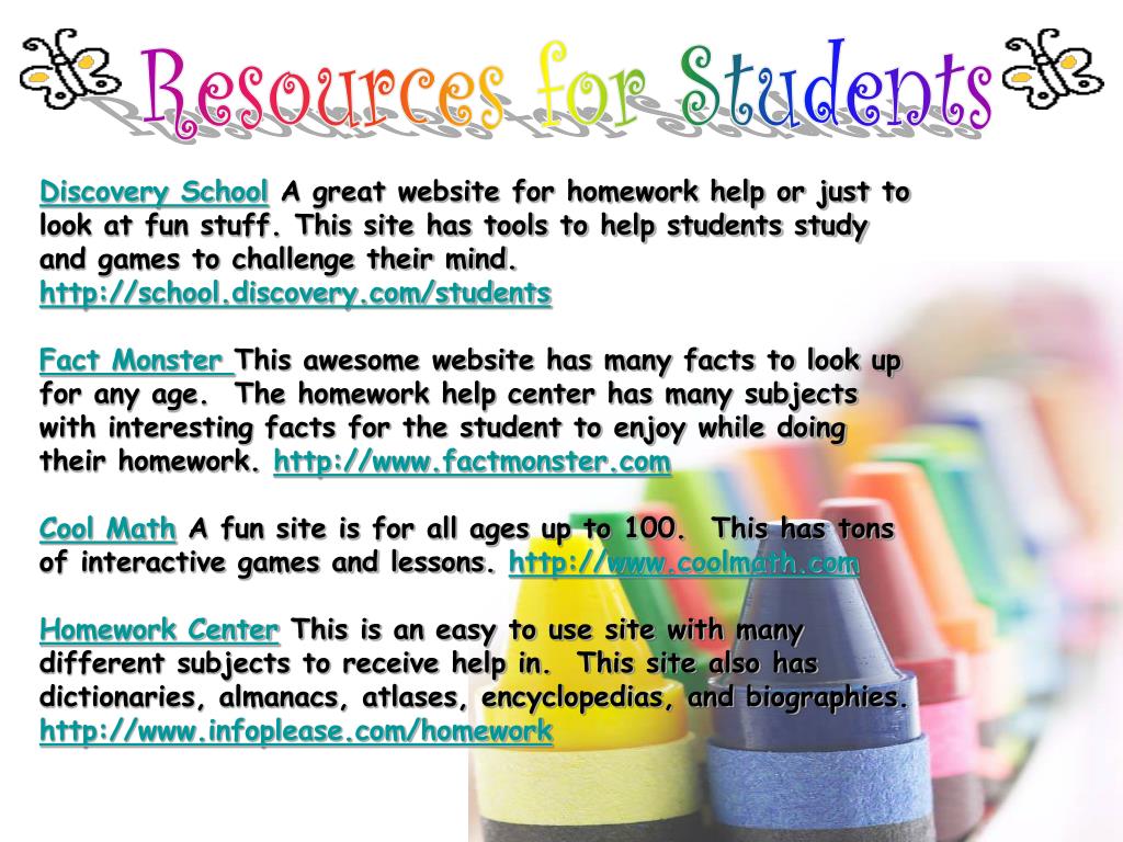 Resources for Students Discovery School A great website for homework help or just to look at fun stuff. This site has tools to help students study and games to challenge their mind. http://school.discovery.com/students Fact Monster This awesome website has many facts to look up for any age. The homework help center has many subjects with interesting facts for the student to enjoy while doing their homework. http://www.factmonster.com Cool Math A fun site is for all ages up to 100. This has tons of interactive games and lessons. http://www.coolmath.com Homework Center This is an easy to use site with many different subjects to receive help in. This site also has dictionaries, almanacs, atlases, encyclopedias, and biographies. http://www.infoplease.com/homework