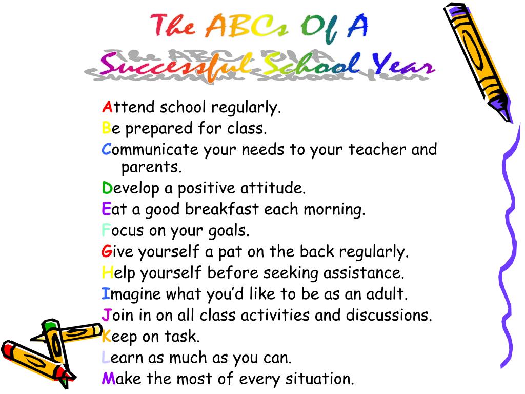 The ABCs Of A Successful School Year Attend school regularly. Be prepared for class. Communicate your needs to your teacher and parents. Develop a positive attitude. Eat a good breakfast each morning. Focus on your goals. Give yourself a pat on the back regularly. Help yourself before seeking assistance. Imagine what you’d like to be as an adult. Join in on all class activities and discussions. Keep on task. Learn as much as you can. Make the most of every situation.
