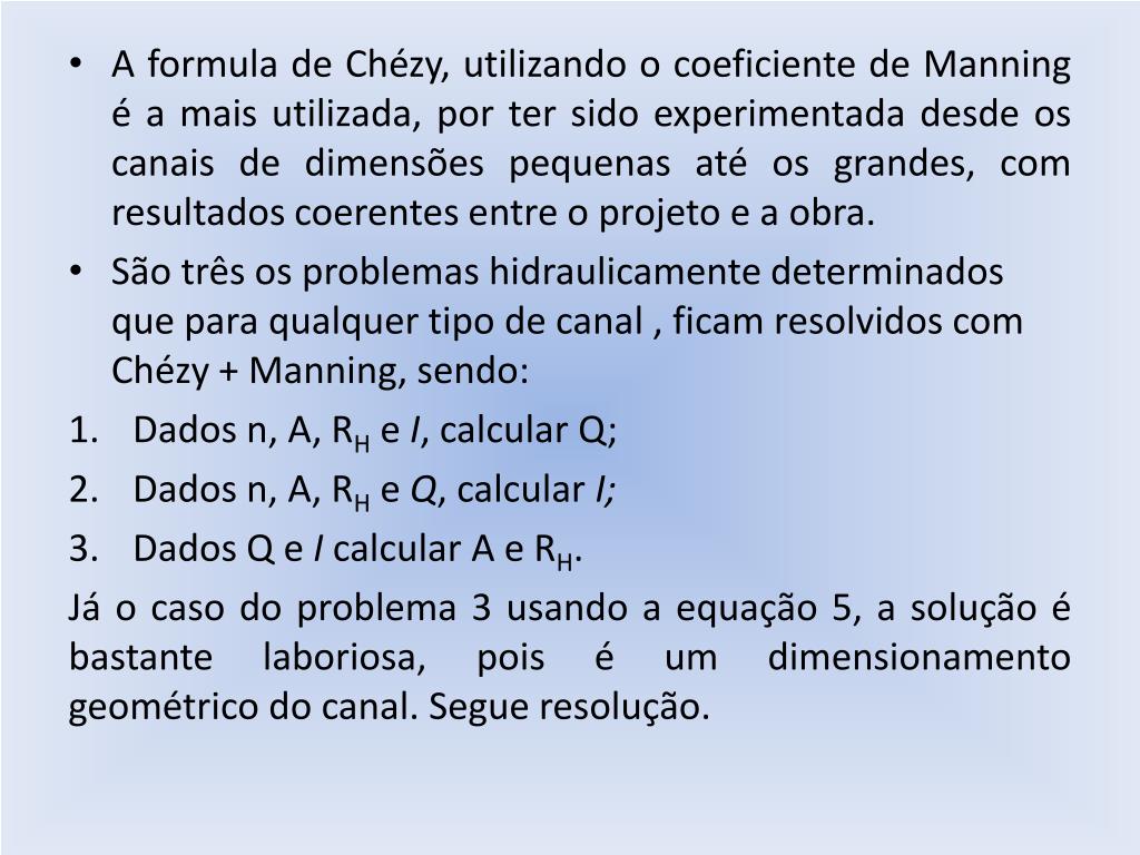 A formula de Chézy, utilizando o coeficiente de Manning é a mais utilizada, por ter sido experimentada desde os canais de dimensões pequenas até os grandes, com resultados coerentes entre o projeto e a obra. • São três os problemas hidraulicamente determinados que para qualquer tipo de canal , ficam resolvidos com Chézy + Manning, sendo: • Dados n, A, RH e I, calcular Q; • Dados n, A, RH e Q, calcular I; • Dados Q e I calcular A e RH. Já o caso do problema 3 usando a equação 5, a solução é bastante laboriosa, pois é um dimensionamento geométrico do canal. Segue resolução.
