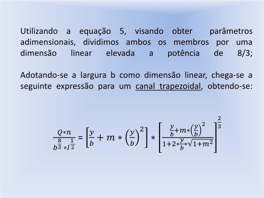 Utilizando a equação 5, visando obter parâmetros adimensionais, dividimos ambos os membros por uma dimensão linear elevada a potência de 8/3;Adotando-se a largura b como dimensão linear, chega-se a seguinte expressão para um canal trapezoidal, obtendo-se: =