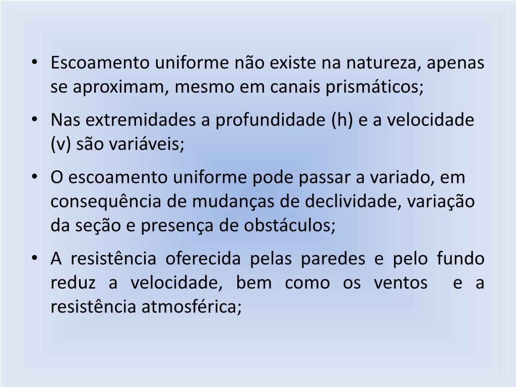 Escoamento uniforme não existe na natureza, apenas se aproximam, mesmo em canais prismáticos; • Nas extremidades a profundidade (h) e a velocidade (v) são variáveis; • O escoamento uniforme pode passar a variado, em consequência de mudanças de declividade, variação da seção e presença de obstáculos; • A resistência oferecida pelas paredes e pelo fundo reduz a velocidade, bem como os ventos e a resistência atmosférica;