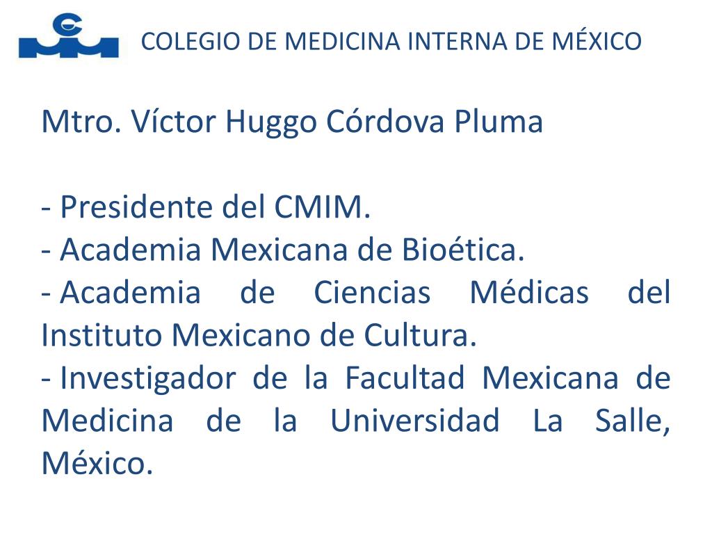 COLEGIO DE MEDICINA INTERNA DE MÉXICO. Mtro. Víctor Huggo Córdova Pluma Presidente del CMIM. Academia Mexicana de Bioética. Academia de Ciencias Médicas del Instituto Mexicano de Cultura. Investigador de la Facultad Mexicana de Medicina de la Universidad La Salle, México.