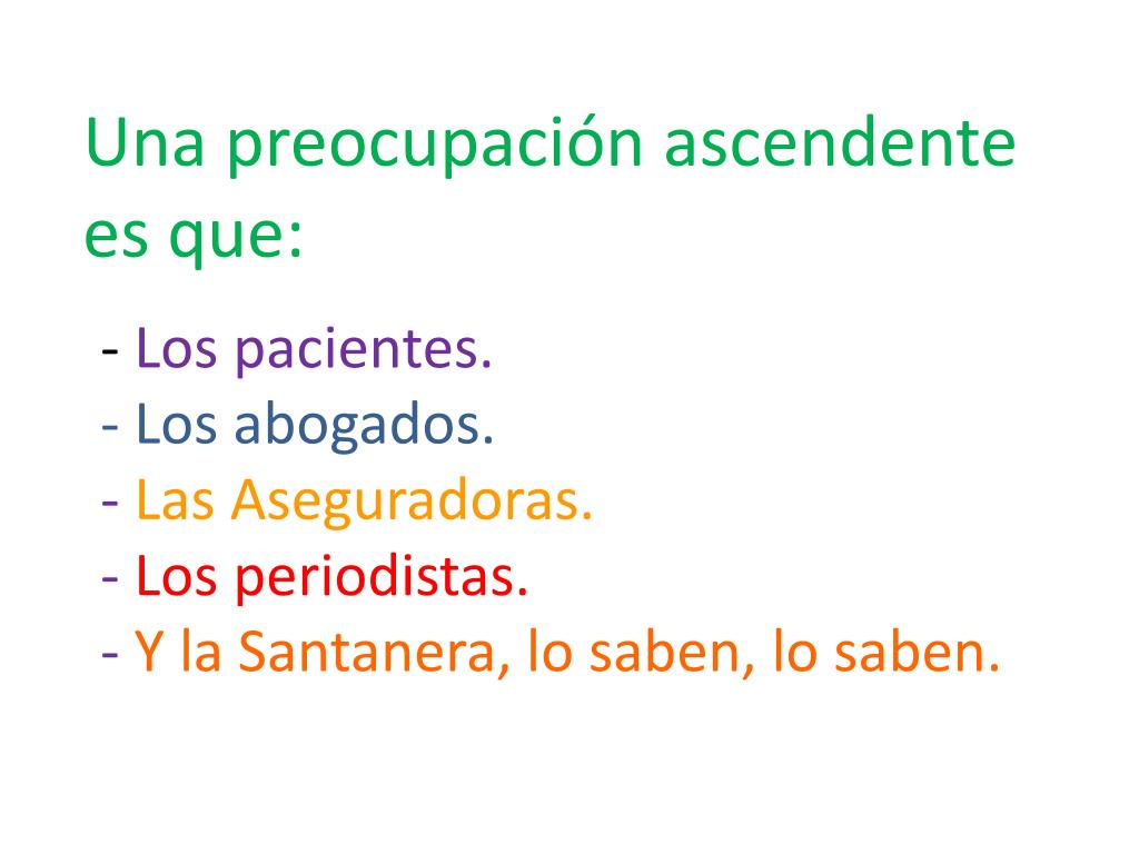 Una preocupación ascendente es que: • Los pacientes. • Los abogados. • Las Aseguradoras. • Los periodistas. • Y la Santanera, lo saben, lo saben.