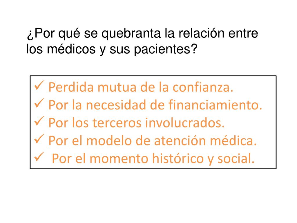 ¿Por qué se quebranta la relación entre los médicos y sus pacientes? • Perdida mutua de la confianza. • Por la necesidad de financiamiento. • Por los terceros involucrados. • Por el modelo de atención médica. • Por el momento histórico y social.