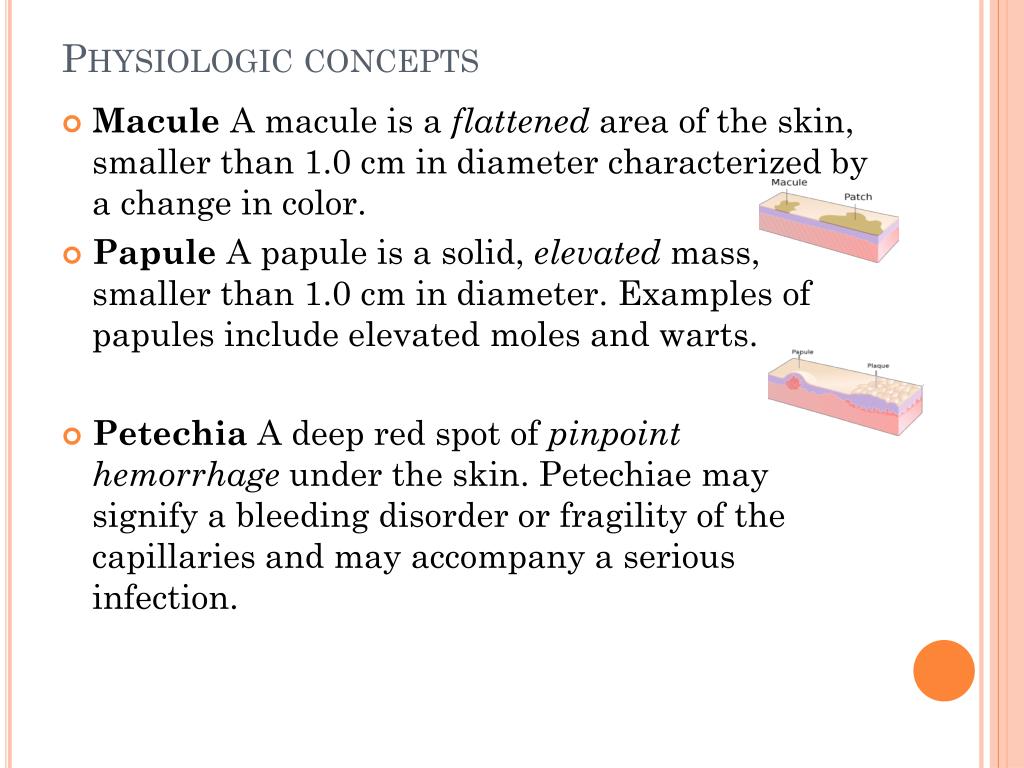 Physiologic concepts • MaculeA macule is a flattened area of the skin, smaller than 1.0 cm in diameter characterized by a change in color. • Papule A papule is a solid, elevated mass, smaller than 1.0 cm in diameter. Examples of papules include elevated moles and warts. • Petechia A deep red spot of pinpoint hemorrhage under the skin. Petechiae may signify a bleeding disorder or fragility of the capillaries and may accompany a serious infection.