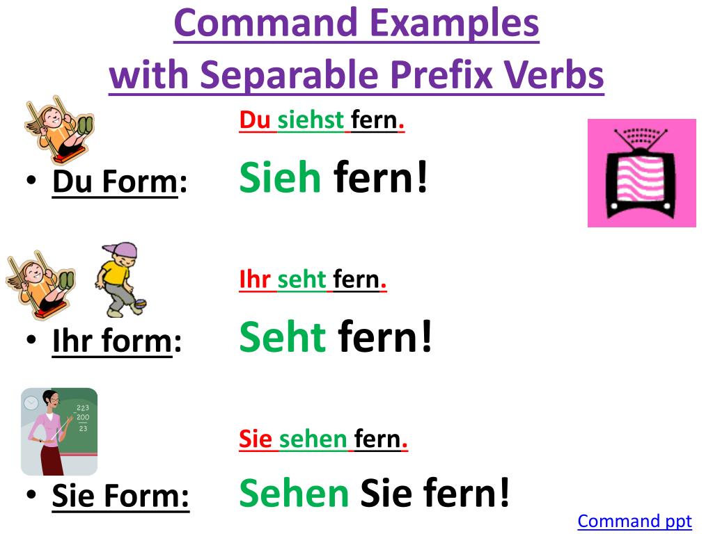 Command Exampleswith Separable Prefix Verbs Du siehstfern. • Du Form:Sieh fern! Ihrsehtfern. • Ihr form: Seht fern! Siesehenfern. • Sie Form:SehenSie fern! Command ppt