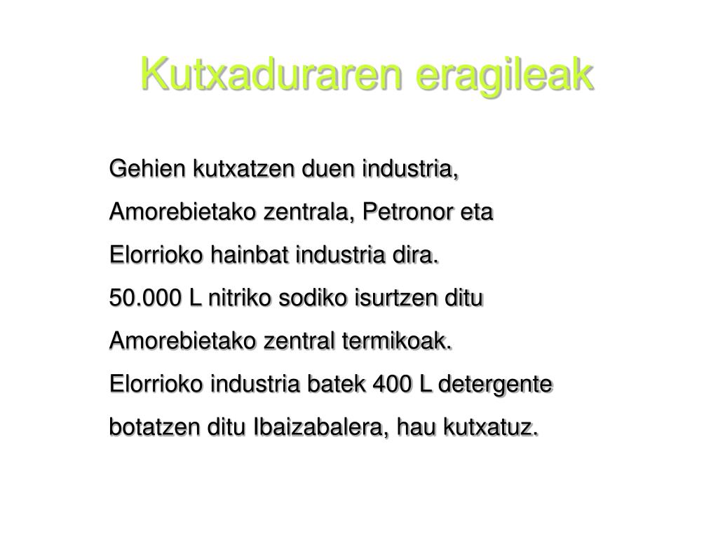 Kutxaduraren eragileak Gehien kutxatzen duen industria, Amorebietako zentrala, Petronor eta Elorrioko hainbat industria dira. 50.000 L nitriko sodiko isurtzen ditu Amorebietako zentral termikoak. Elorrioko industria batek 400 L detergente botatzen ditu Ibaizabalera, hau kutxatuz.