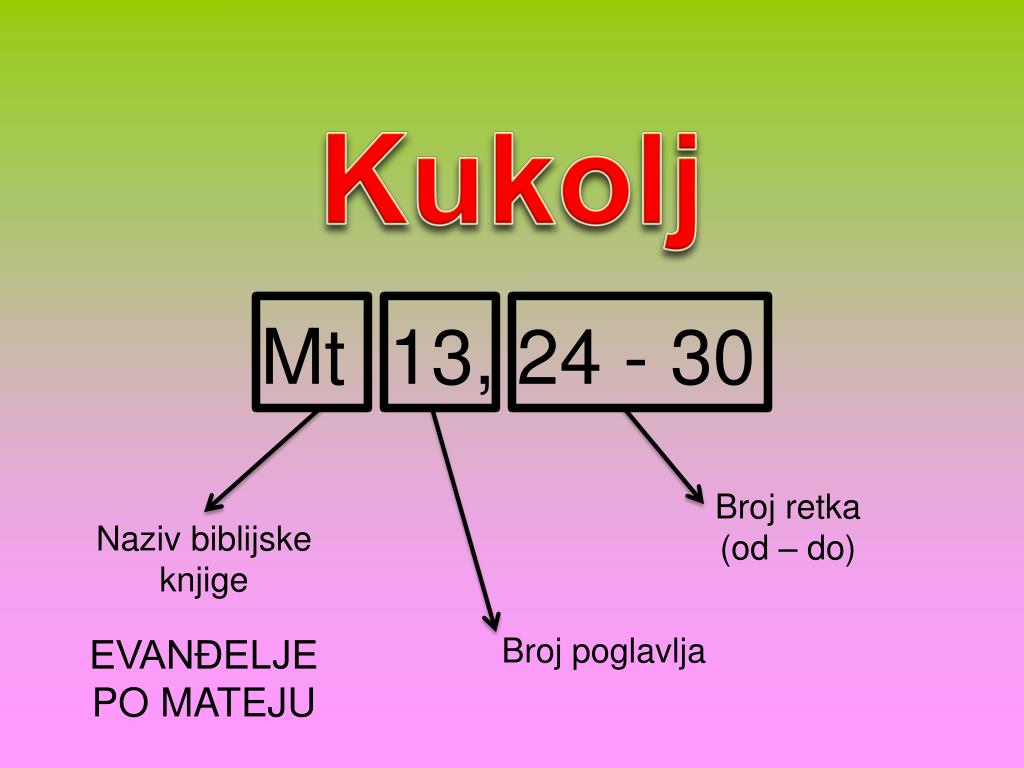 KUKOLJ NA NJIVI. Isusova parabola. Kukolj. Mt 13, 24 - 30. Broj retka (od – do). Naziv biblijske knjige EVANĐELJE PO MATEJU. Broj poglavlja.