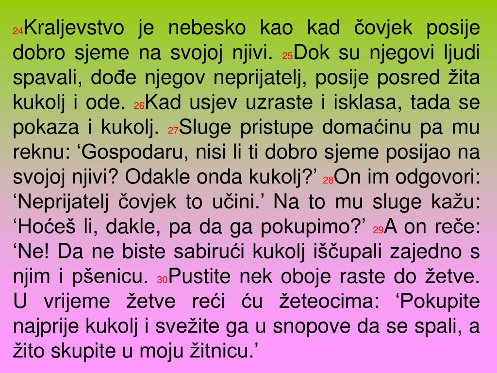 24Kraljevstvo je nebesko kao kad čovjek posije dobro sjeme na svojoj njivi. 25Dok su njegovi ljudi spavali, dođe njegov neprijatelj, posije posred žita kukolj i ode. 26Kad usjev uzraste i isklasa, tada se pokaza i kukolj. 27Sluge pristupe domaćinu pa mu reknu: ‘Gospodaru, nisi li ti dobro sjeme posijao na svojoj njivi? Odakle onda kukolj?’ 28On im odgovori: ‘Neprijatelj čovjek to učini.’ Na to mu sluge kažu: ‘Hoćeš li, dakle, pa da ga pokupimo?’ 29A on reče: ‘Ne! Da ne biste sabirući kukolj iščupali zajedno s njim i pšenicu. 30Pustite nek oboje raste do žetve. U vrijeme žetve reći ću žeteocima: ‘Pokupite najprije kukolj i svežite ga u snopove da se spali, a žito skupite u moju žitnicu.’
