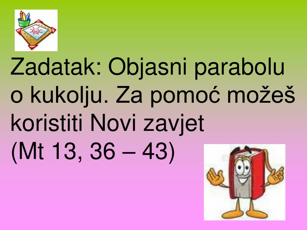 Zadatak: Objasni parabolu o kukolju. Za pomoć možeš koristiti Novi zavjet (Mt 13, 36 – 43)