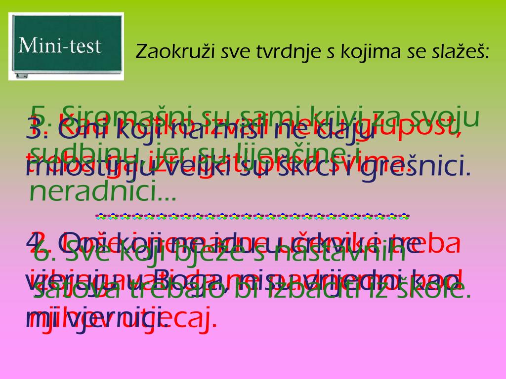 Zaokruži sve tvrdnje s kojima se slažeš: 5. Siromašni su sami krivi za svoju sudbinu, jer su lijenčine i neradnici... 1. Kad netko izvali neku glupost, treba ga izrugati pred svima. 3. Oni koji na misi ne daju milostinju veliki su škrci i grešnici. 4. Oni koji ne idu u crkvu i ne vjeruju u Boga, nisu vrijedni kao mi vjernici. 2. Loše i nemarne učenike treba izbjegavati da ne padnemo pod njihov utjecaj. 6. Sve koji bježe s nastavnih satova trebalo bi izbaciti iz škole.