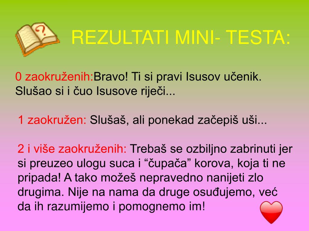 REZULTATI MINI- TESTA: 0 zaokruženih:Bravo! Ti si pravi Isusov učenik. Slušao si i čuo Isusove riječi... 1 zaokružen: Slušaš, ali ponekad začepiš uši... 2 i više zaokruženih: Trebaš se ozbiljno zabrinuti jer si preuzeo ulogu suca i “čupača” korova, koja ti ne pripada! A tako možeš nepravedno nanijeti zlo drugima. Nije na nama da druge osuđujemo, već da ih razumijemo i pomognemo im!