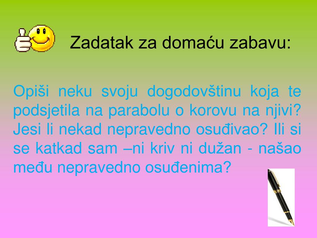 Zadatak za domaću zabavu: Opiši neku svoju dogodovštinu koja te podsjetila na parabolu o korovu na njivi? Jesi li nekad nepravedno osuđivao? Ili si se katkad sam –ni kriv ni dužan - našao među nepravedno osuđenima?
