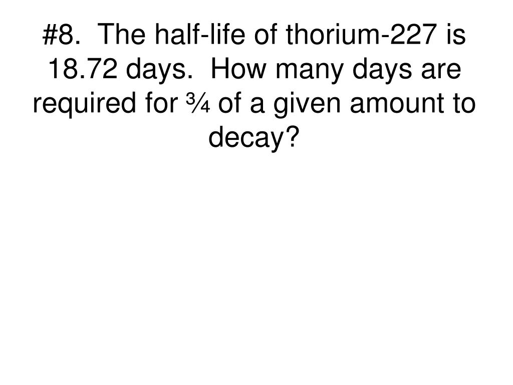 #8. The half-life of thorium-227 is 18.72 days. How many days are required for ¾ of a given amount to decay?