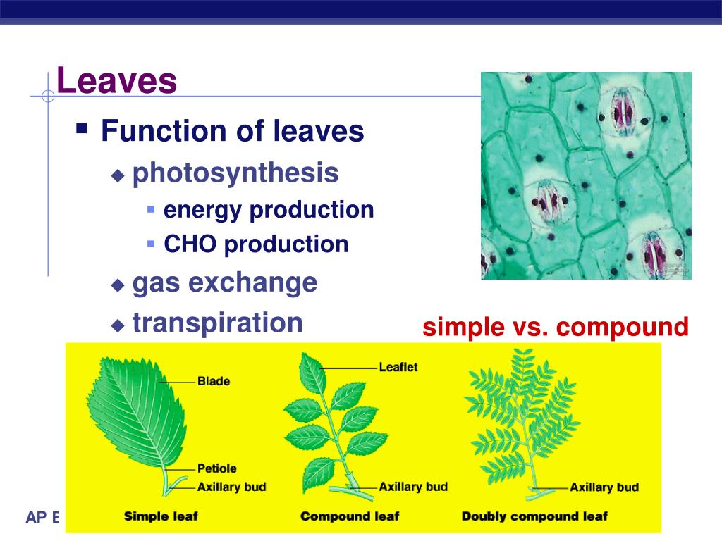 Leaves • Function of leaves • photosynthesis • energy production • CHO production • gas exchange • transpiration simple vs. compound