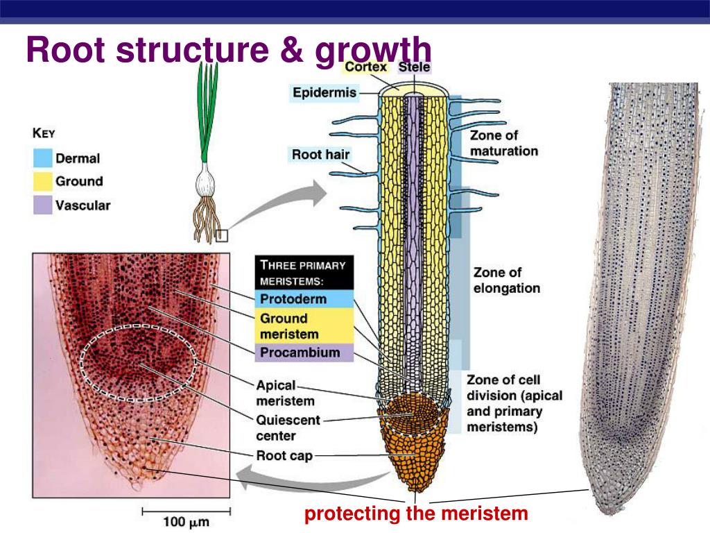 Growth in Plants • Specific regions of growth: meristems • stem cells: perpetually embryonic tissue • regenerate new cells • apicalshoot meristem • growth in length • primary growth • apical root meristem • growth in length • primary growth • lateral meristem • growth in girth • secondary growth
