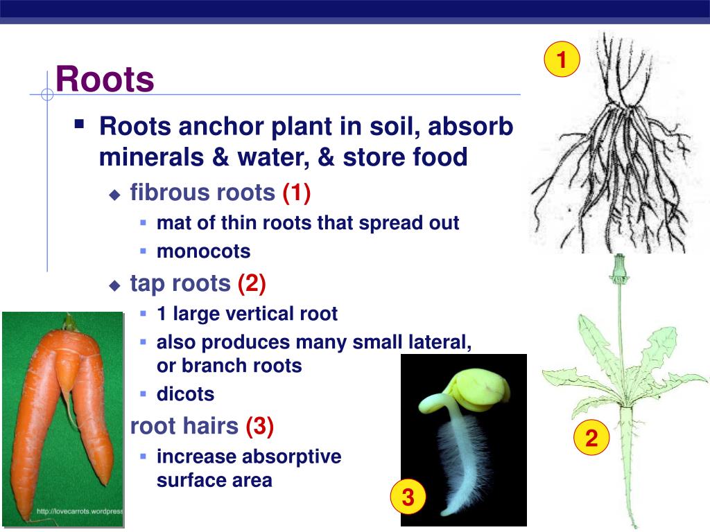 1 Roots • Roots anchor plant in soil, absorb minerals & water, & store food • fibrous roots (1) • mat of thin roots that spread out • monocots • tap roots (2) • 1 large vertical root • also produces many small lateral, or branch roots • dicots • root hairs (3) • increase absorptive surface area 2 3