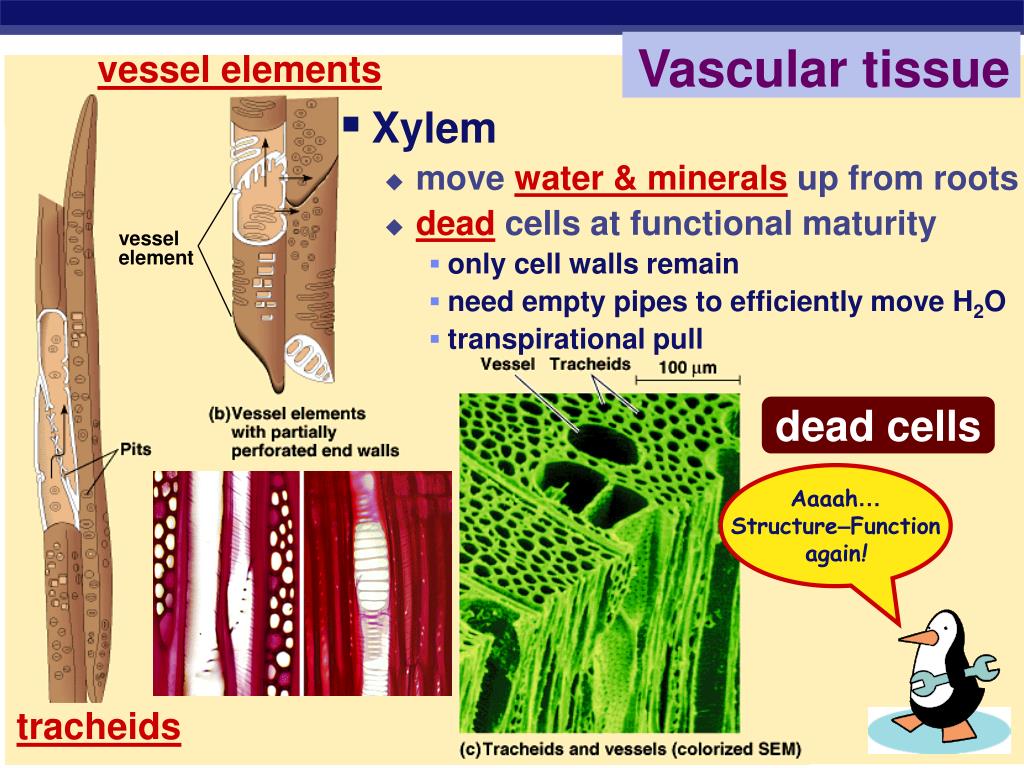 Vascular tissue vessel elements • Xylem • move water & minerals up from roots • dead cells at functional maturity • only cell walls remain • need empty pipes to efficiently move H2O • transpirational pull vessel element dead cells Aaaah… Structure–Functionagain! tracheids