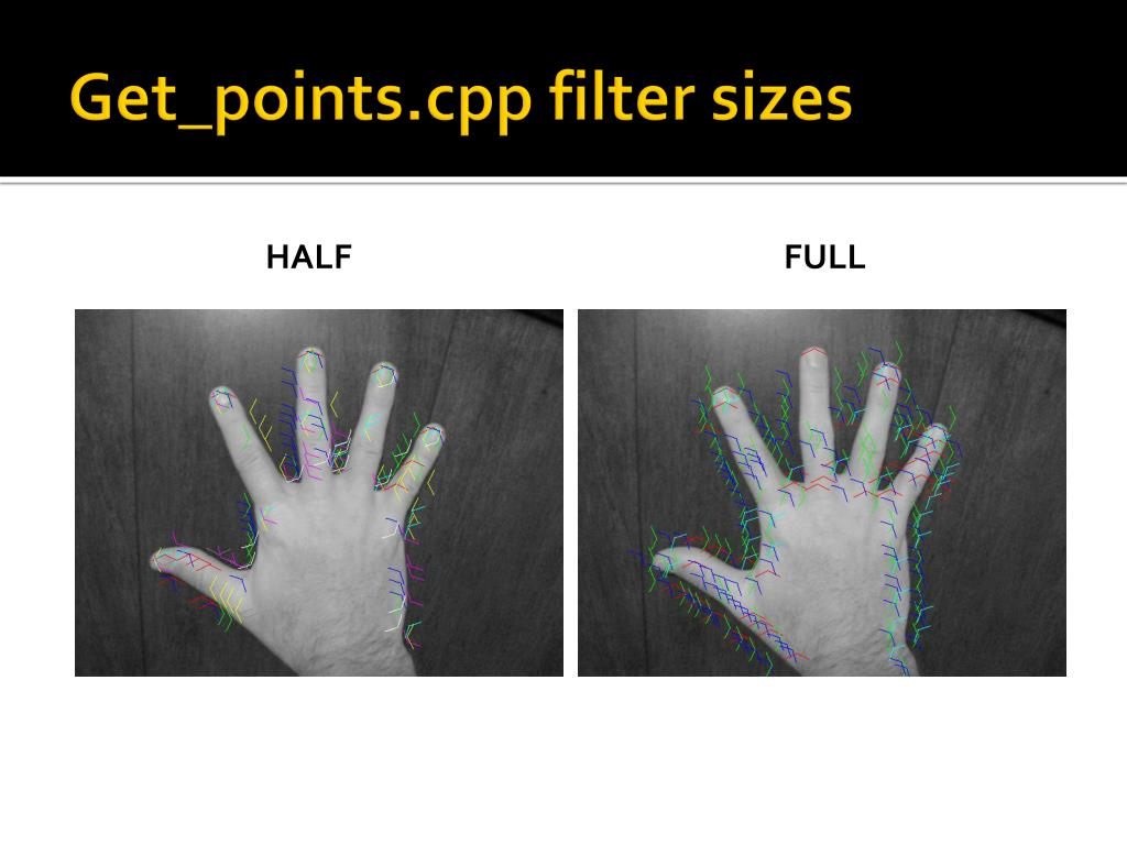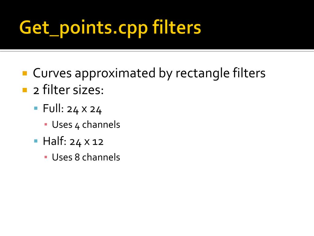 Get_points.cpp filters • Curves approximated by rectangle filters • 2 filter sizes: • Full: 24 x 24 • Uses 4 channels • Half: 24 x 12 • Uses 8 channels