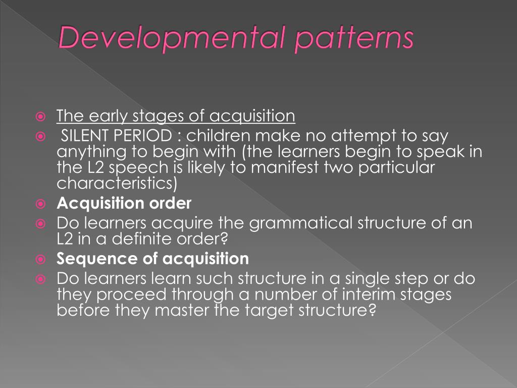 Developmental patterns • The early stages of acquisition • SILENT PERIOD : children make no attempt to say anything to begin with (the learners begin to speak in the L2 speech is likely to manifest two particular characteristics) • Acquisition order • Do learners acquire the grammatical structure of an L2 in a definite order? • Sequence of acquisition • Do learners learn such structure in a single step or do they proceed through a number of interim stages before they master the target structure?