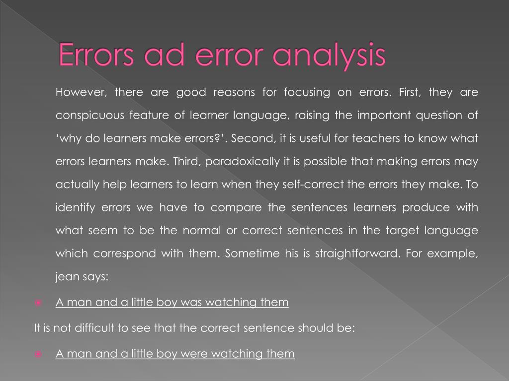 Errors ad error analysis However, there are good reasons for focusing on errors. First, they are conspicuous feature of learner language, raising the important question of ‘why do learners make errors?’. Second, it is useful for teachers to know what errors learners make. Third, paradoxically it is possible that making errors may actually help learners to learn when they self-correct the errors they make. To identify errors we have to compare the sentences learners produce with what seem to be the normal or correct sentences in the target language which correspond with them. Sometime his is straightforward. For example, jean says: • A man and a little boy was watching them It is not difficult to see that the correct sentence should be: • A man and a little boy were watching them