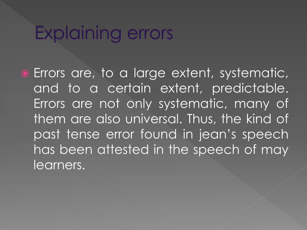 Explaining errors • Errors are, to a large extent, systematic, and to a certain extent, predictable. Errors are not only systematic, many of them are also universal. Thus, the kind of past tense error found in jean’s speech has been attested in the speech of may learners.
