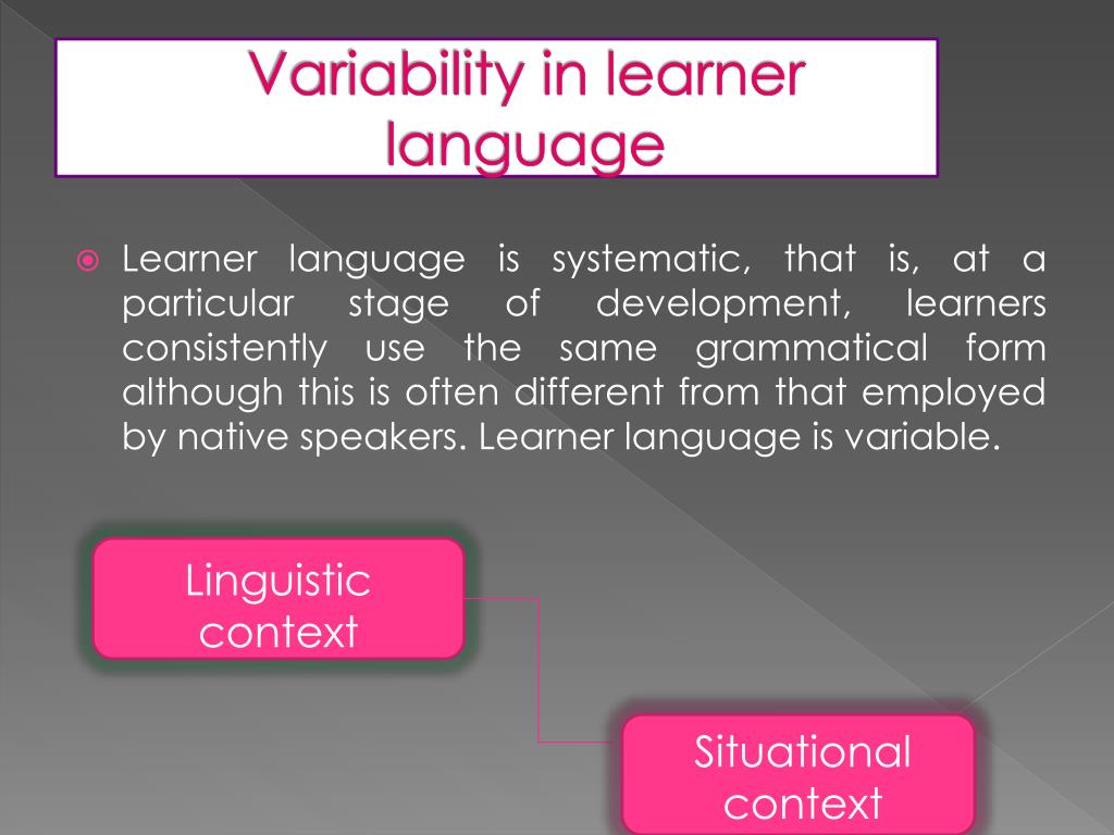 Research on variability has sought to show that, although allowance should perhaps be made for some free variation, variability in learner language is systematic. • The use of specific grammatical forms has been shown to vary according to the linguistic context ad the psycholinguistic context.