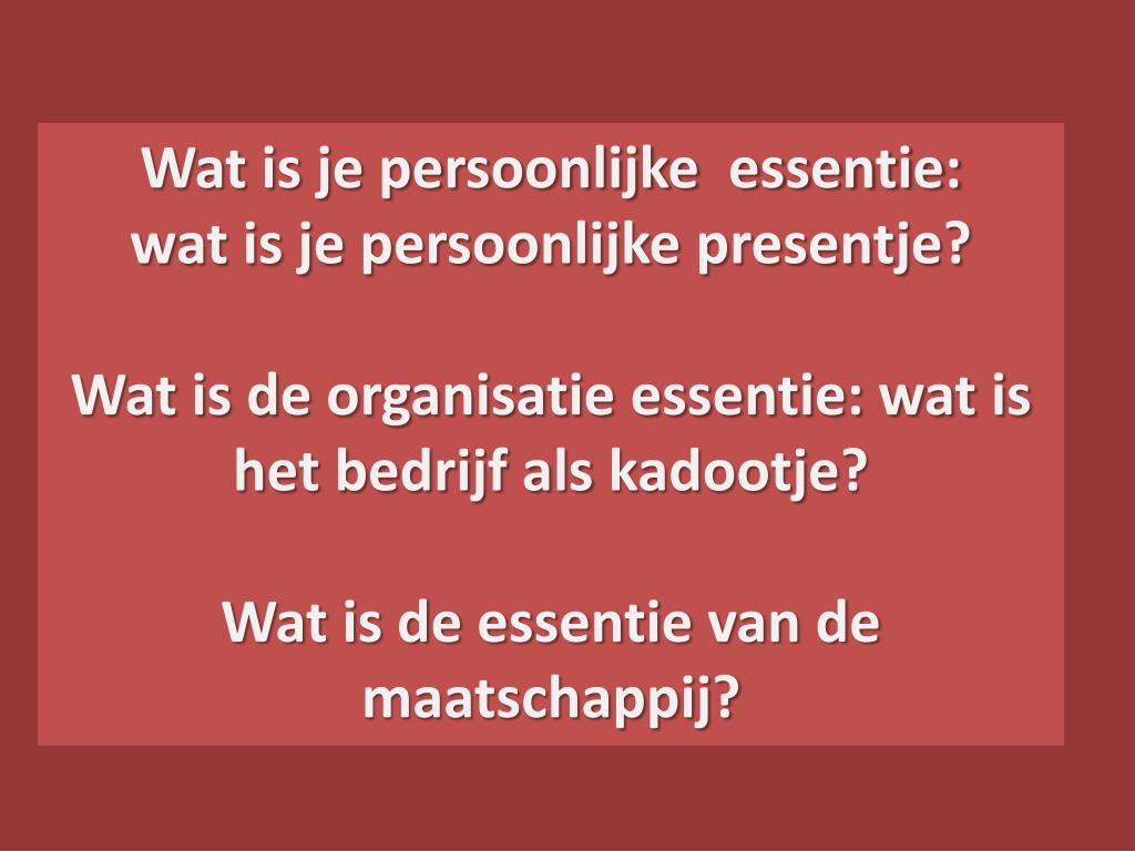 Wat is je persoonlijke essentie: wat is je persoonlijke presentje? Wat is de organisatie essentie: wat is het bedrijf als kadootje? Wat is de essentie van de maatschappij?