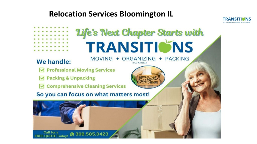 2. Transitions by Go Green provide seamless relocation services in Bloomington, IL, ensuring a stress-free move for individuals and families. Their team handles every aspect of the move, from packing and organizing to transportation and setup. With a focus on eco-friendly solutions and personalized care, they make transitions smooth and efficient. Trust Transitions by Go Green for a hassle-free relocation experience tailored to your needs.