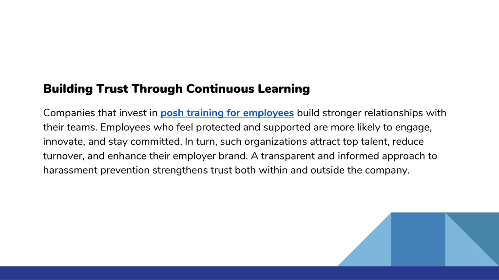 Building Trust Through Continuous Learning Companies that invest in posh training for employees build stronger relationships with their teams. Employees who feel protected and supported are more likely to engage, innovate, and stay committed. In turn, such organizations attract top talent, reduce turnover, and enhance their employer brand. A transparent and informed approach to harassment prevention strengthens trust both within and outside the company.