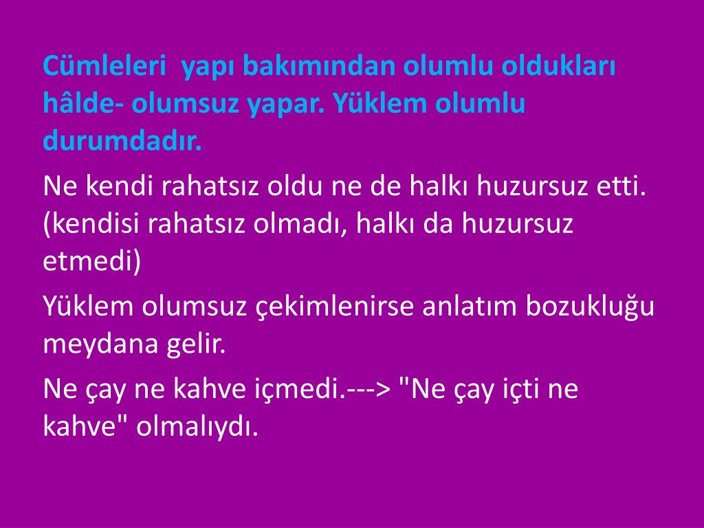 Cümleleri yapı bakımından olumlu oldukları hâlde- olumsuz yapar. Yüklem olumlu durumdadır. Ne kendi rahatsız oldu ne de halkı huzursuz etti. (kendisi rahatsız olmadı, halkı da huzursuz etmedi) Yüklem olumsuz çekimlenirse anlatım bozukluğu meydana gelir. Ne çay ne kahve içmedi.---> "Ne çay içti ne kahve" olmalıydı.