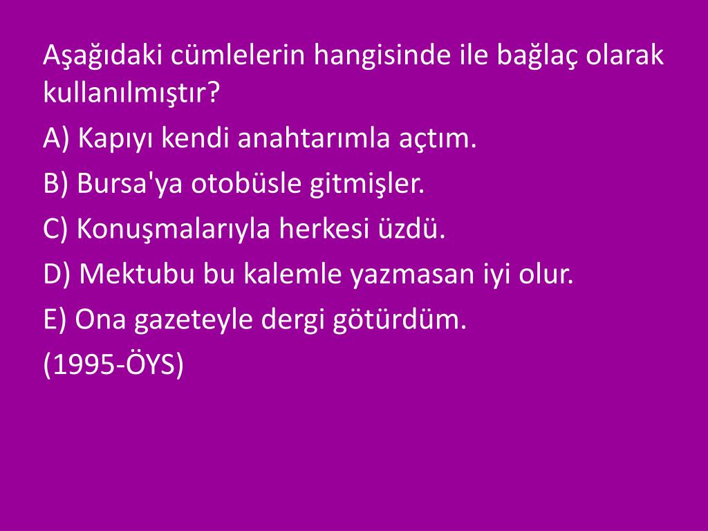Aşağıdaki cümlelerin hangisinde ile bağlaç olarak kullanılmıştır? A) Kapıyı kendi anahtarımla açtım. B) Bursa'ya otobüsle gitmişler. C) Konuşmalarıyla herkesi üzdü. D) Mektubu bu kalemle yazmasan iyi olur. E) Ona gazeteyle dergi götürdüm. (1995-ÖYS)