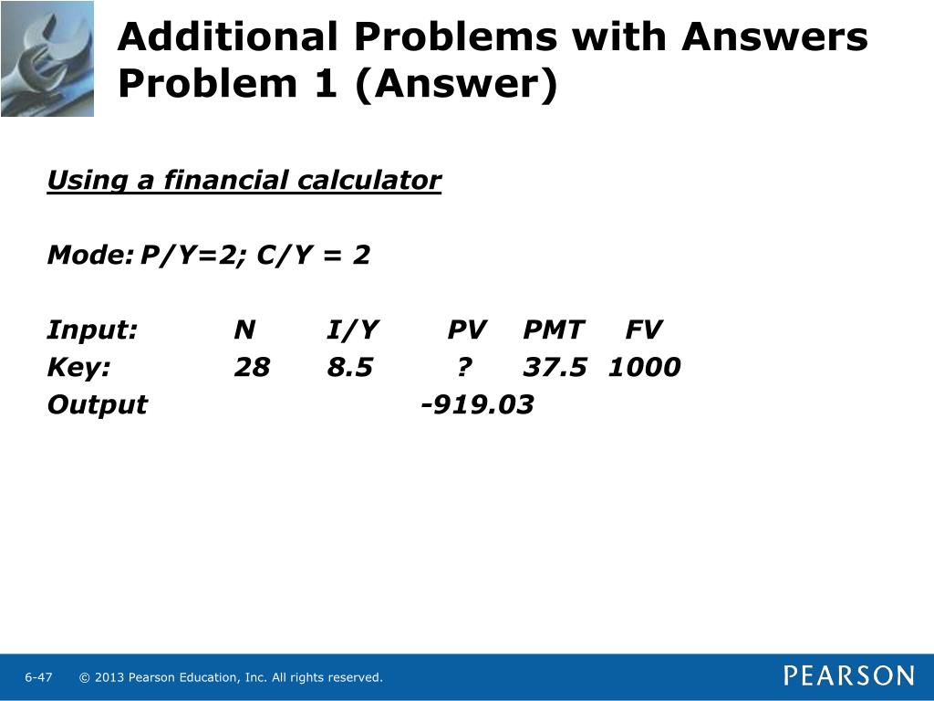 Additional Problems with AnswersProblem 1 (Answer) Using a financial calculator Mode: P/Y=2; C/Y = 2 Input: N I/Y PV PMT FV Key: 28 8.5 ? 37.5 1000 Output -919.03