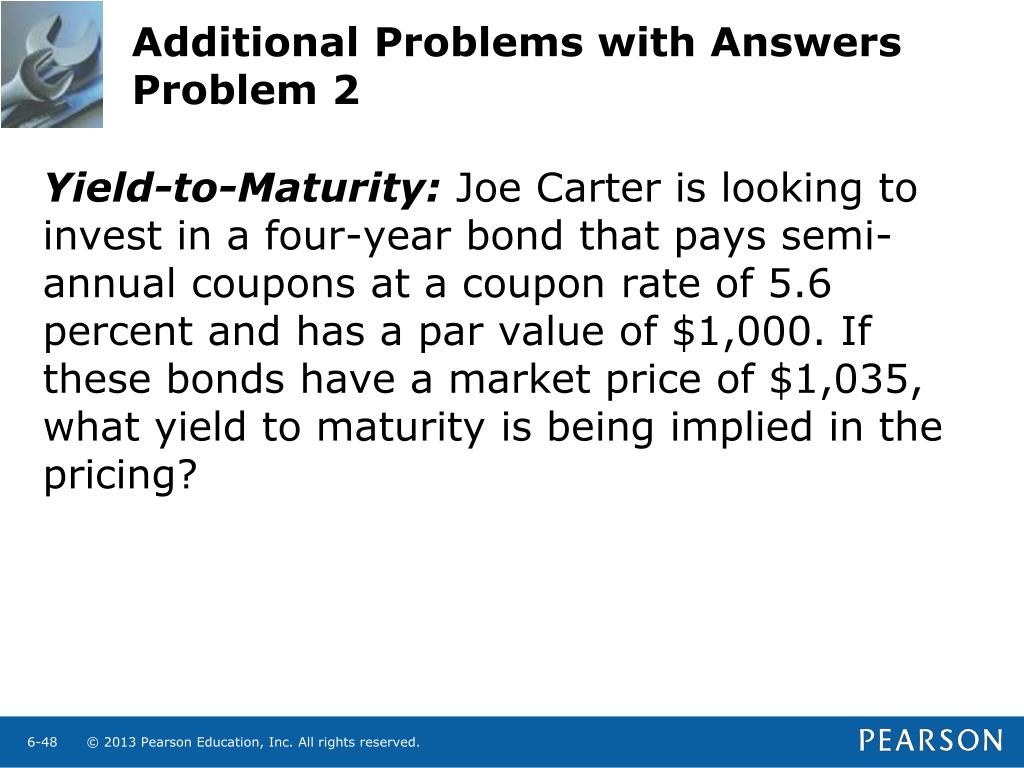 Additional Problems with AnswersProblem 2 Yield-to-Maturity:Joe Carter is looking to invest in a four-year bond that pays semi-annual coupons at a coupon rate of 5.6 percent and has a par value of $1,000. If these bonds have a market price of $1,035, what yield to maturity is being implied in the pricing?