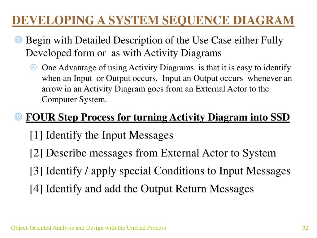 DEVELOPING A SYSTEM SEQUENCE DIAGRAM • Begin with Detailed Description of the Use Case either Fully Developed form or as with Activity Diagrams • One Advantage of using Activity Diagrams is that it is easy to identify when an Input or Output occurs. Input an Output occurs whenever an arrow in an Activity Diagram goes from an External Actor to the Computer System. • FOUR Step Process for turning Activity Diagram into SSD [1] Identify the Input Messages [2] Describe messages from External Actor to System [3] Identify / apply special Conditions to Input Messages [4] Identify and add the Output Return Messages Object-Oriented Analysis and Design with the Unified Process