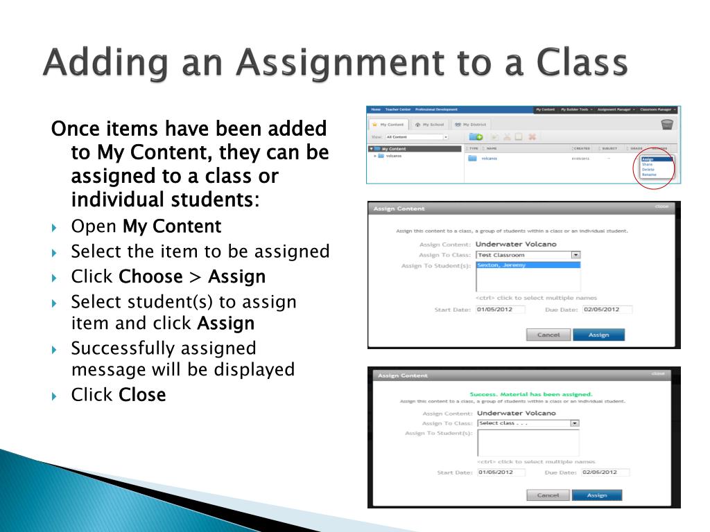 Adding an Assignment to a Class Once items have been added to My Content, they can be assigned to a class or individual students: • Open My Content • Select the item to be assigned • Click Choose > Assign • Select student(s) to assign item and click Assign • Successfully assigned message will be displayed • Click Close