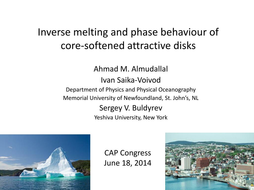 Inverse melting and phase behaviour of core-softened attractive disks. Ahmad M. Almudallal Ivan Saika-Voivod Department of Physics and Physical Oceanography Memorial University of Newfoundland, St. John’s, NL Sergey V. Buldyrev Yeshiva University, New York. CAP Congress June 18, 2014.