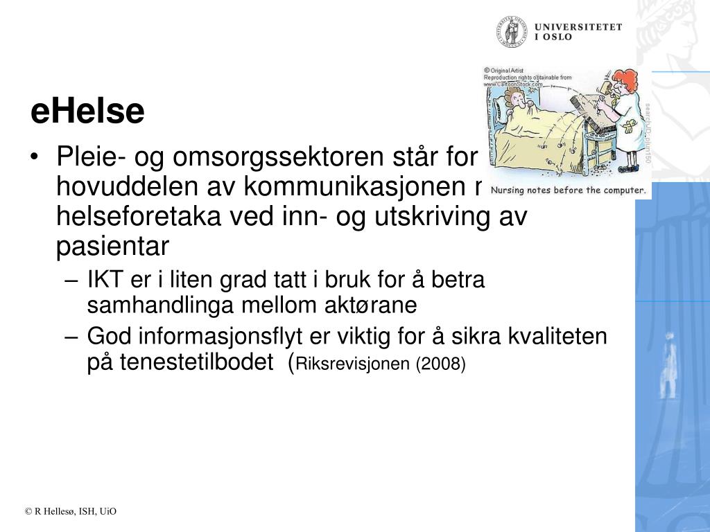 eHelse • Pleie- og omsorgssektoren står for hovuddelen av kommunikasjonen med helseforetaka ved inn- og utskriving av pasientar • IKT eriliten grad tattibruk for å betrasamhandlingamellomaktørane • God informasjonsflyt erviktig for å sikrakvalitetenpåtenestetilbodet (Riksrevisjonen(2008)