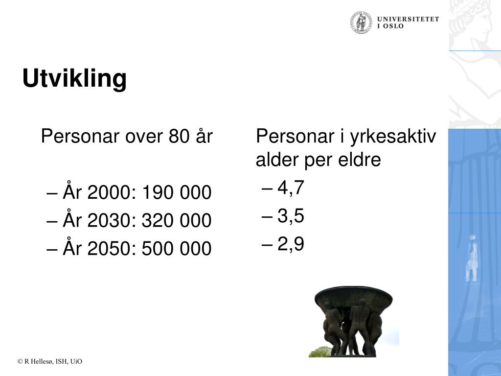 Personar over 80 år År 2000: 190 000 År 2030: 320 000 År 2050: 500 000 Personar i yrkesaktiv alder per eldre 4,7 3,5 2,9 Utvikling