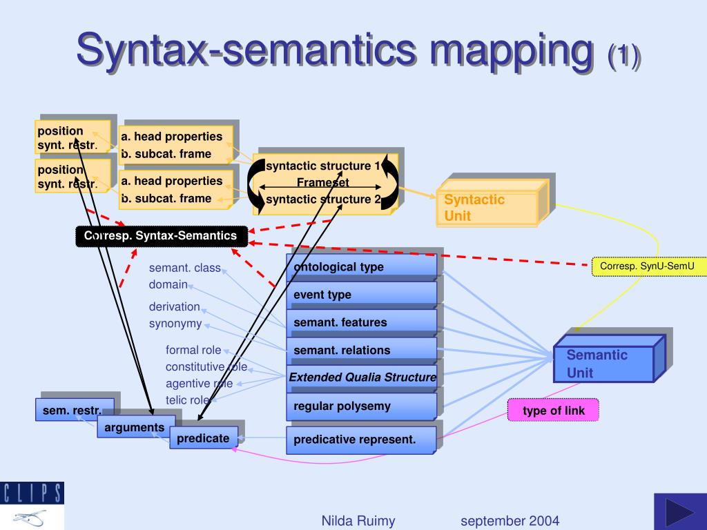 position synt. restr. position synt. restr. a. head properties b. subcat. frame a. head properties b. subcat. frame syntactic structure 1 Frameset Syntactic Unit ontological type event type semant. relations regular polysemy Corresp. SynU-SemU semant. class domain derivation semant. features synonymy formalrole Semantic Unit predicative represent. constitutiverole Extended Qualia Structure agentive role telic role type of link predicate sem. restr. arguments Syntax-semantics mapping (1) syntactic structure 2 Corresp. Syntax-Semantics Nilda Ruimy september 2004