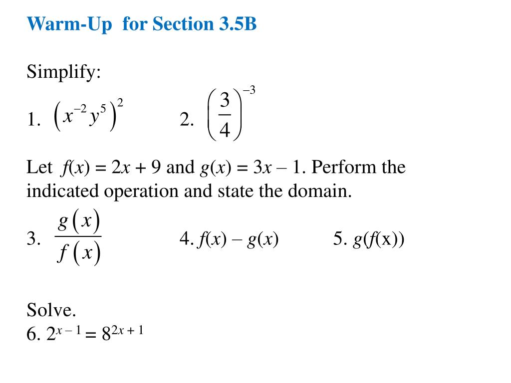 Warm-Up for Section 3.5B Simplify: 1. 2. Let f(x) = 2x + 9 and g(x) = 3x – 1. Perform the indicated operation and state the domain. 3. 4. f(x) – g(x) 5. g(f(x)) Solve. 6. 2x – 1 = 82x + 1