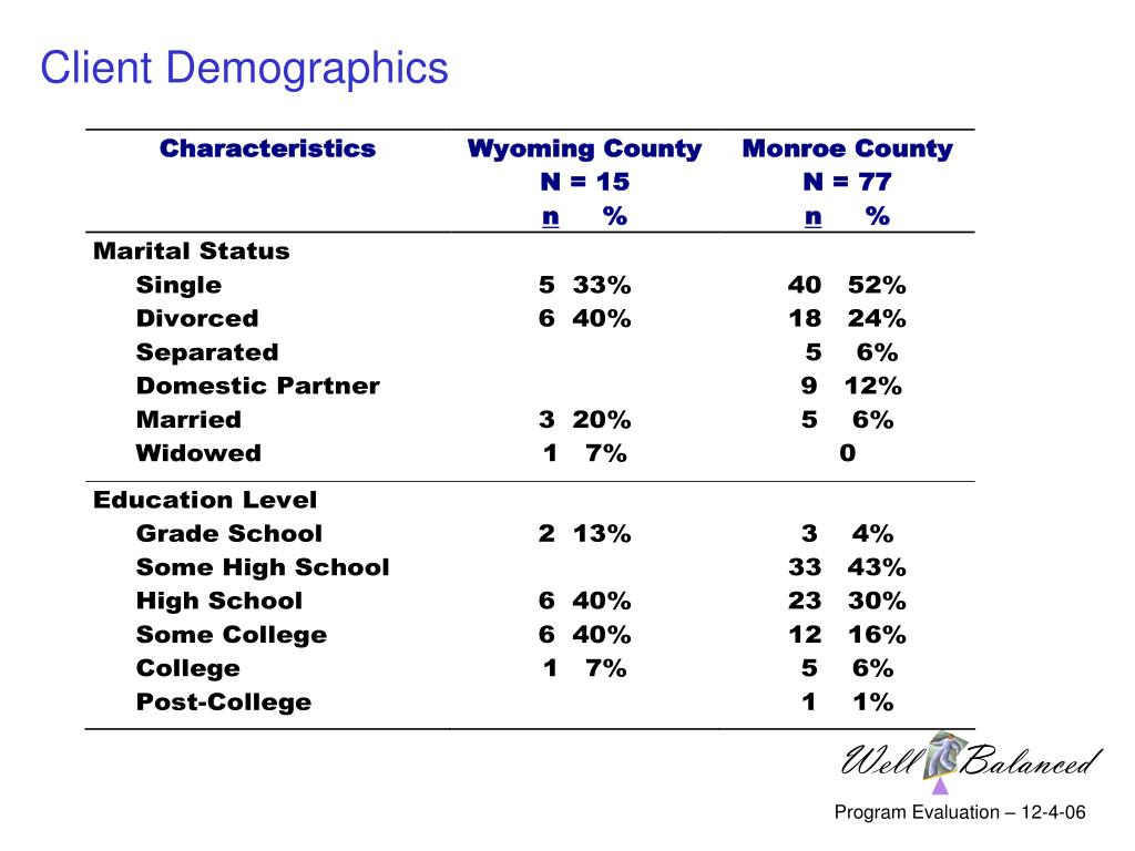 Program Design: 2006 • “Embedded” nurse wellness coach (clinic employee) works in tandem with mental health clinicians and care coordinators on client-determined physical health issues • Caseload: 20 slots, revolving enrollment, attends SPOA • Not time limited; pace/frequency of contacts vary • Eligibility: Care coordination enrollees with moderate to high risk physical health problems, by referral • Program dovetails with Monroe’s Well Balanced Program, using same assessment, documentation and planning tools • Not disease-specific: interventions customized to individual health problems, client wishes, capacities and readiness • Maximize internet, disease-management protocols “best practices” for education