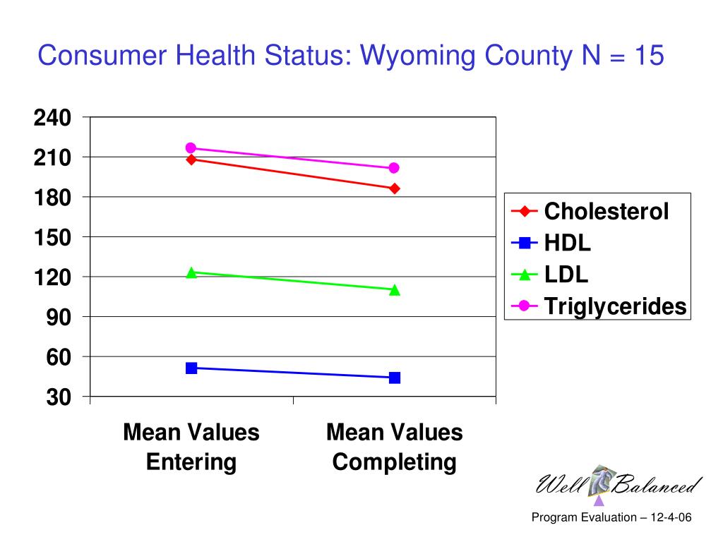 Consumer Health Status: Wyoming County N = 15 Entering: 1.25 packs/20 years (average)Completing: 0.78 packs1 Quit 4 months, 4 reduced >1/2 ppd