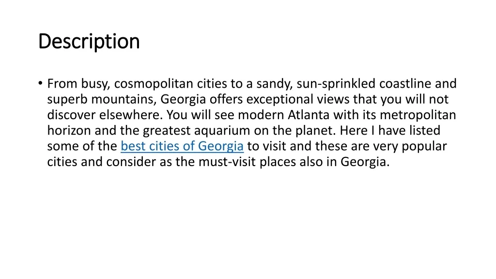 Description • From busy, cosmopolitan cities to a sandy, sun-sprinkled coastline and superb mountains, Georgia offers exceptional views that you will not discover elsewhere. You will see modern Atlanta with its metropolitan horizon and the greatest aquarium on the planet. Here I have listed some of the best cities of Georgia to visit and these are very popular cities and consider as the must-visit places also in Georgia.