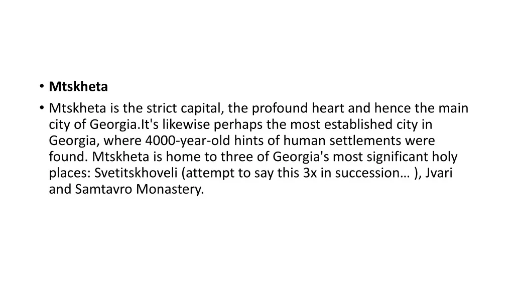 Mtskheta • Mtskheta is the strict capital, the profound heart and hence the main city of Georgia.It's likewise perhaps the most established city in Georgia, where 4000-year-old hints of human settlements were found. Mtskheta is home to three of Georgia's most significant holy places: Svetitskhoveli (attempt to say this 3x in succession… ), Jvari and Samtavro Monastery.