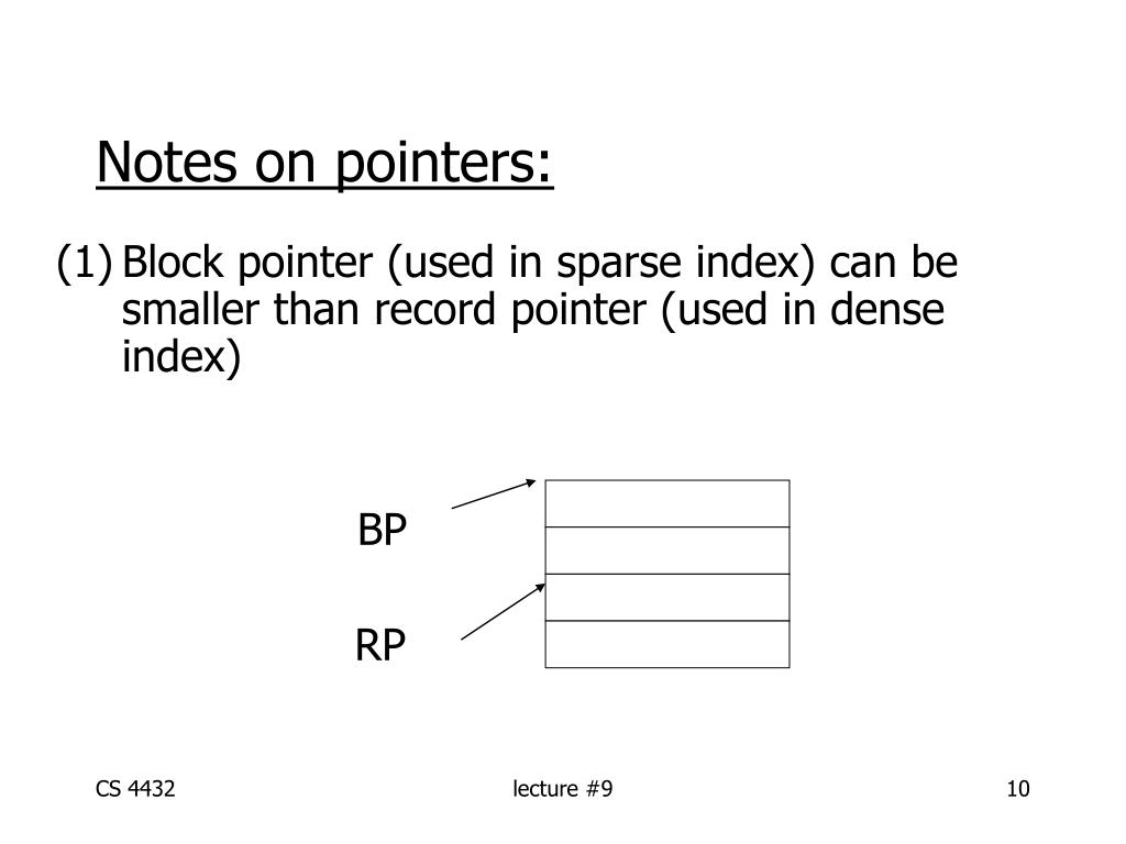 Notes on pointers: • Block pointer (used in sparse index) can be smaller than record pointer (used in dense index) BP RP lecture #9